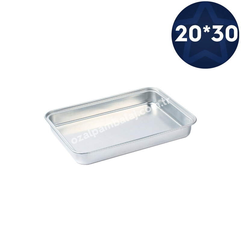 20 cm eninde , 30 cm boyunda , 3 cm yüksekliğinde 400 micron kalınlığında tek (veya isteğe göre çok) kullanımlık kalın alüminyum tepsidir.