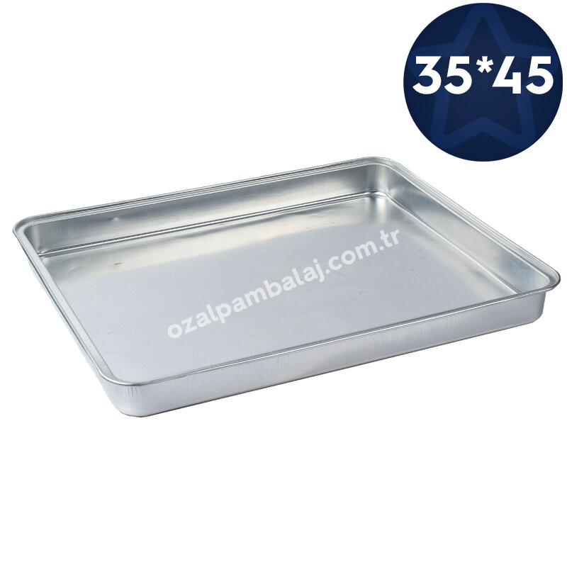 35 cm eninde ,  44 cm boyunda ,  4 cm yüksekliğinde 400 micron kalınlığında tek (veya isteğe göre çok) kullanımlık kalın alüminyum tepsidir.
