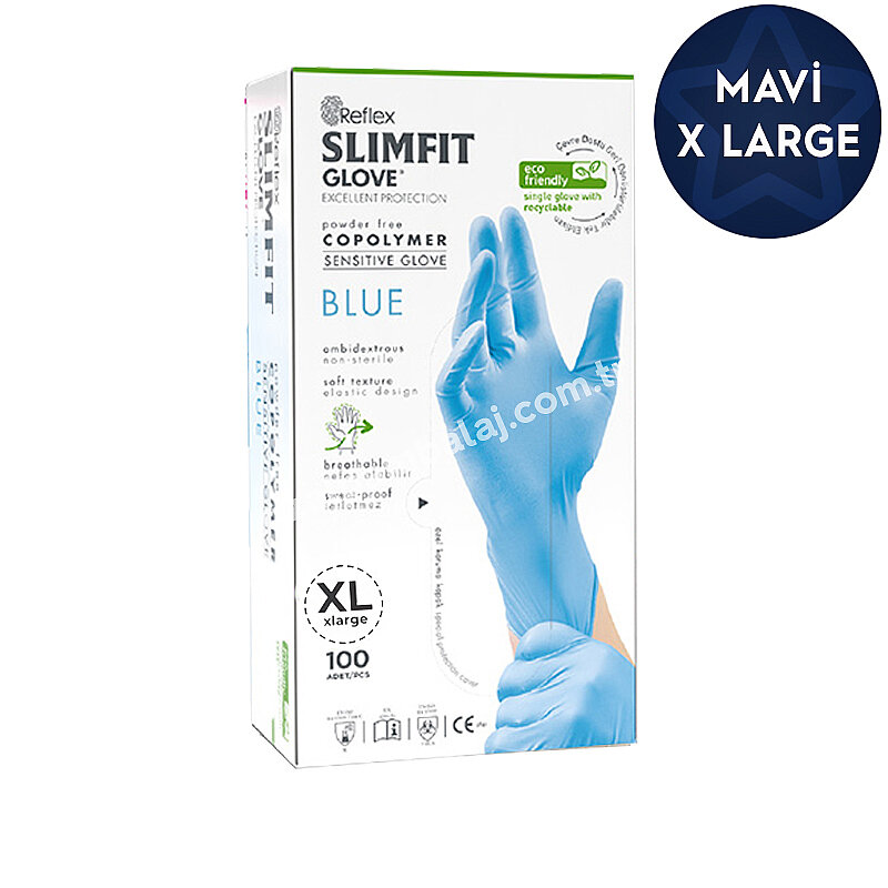 Reflex Slimfit Hibrit Pudrasız Mavi Eldiven (X Large /Ekstra Büyük), Copolymer TPE yapısı sayesinde günlük kullanımdan profesyonel işlere kadar güvenle tercih edilir. Eli ve parmakları mükemmel kavrar; yumuşak dokusu ve cilt dostu yapısıyla uzun süreli konforda fark yaratır.
