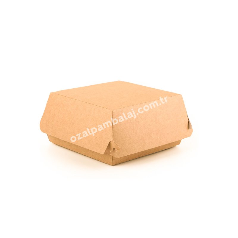 13 cm * 13 cm H:10 cm ölçülerinde , kraft kartondan imal edilmiş , büyük boy hamburger kutusudur.