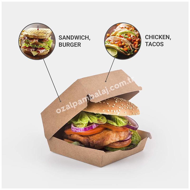 Özellikle tüm boy hamburgerler ,patates cipsi,soğan halkası,nugget,stick peynir,tavuk vb. yan ürünler gibi ürünler için en ideal kapaklı kraft kutudur.
